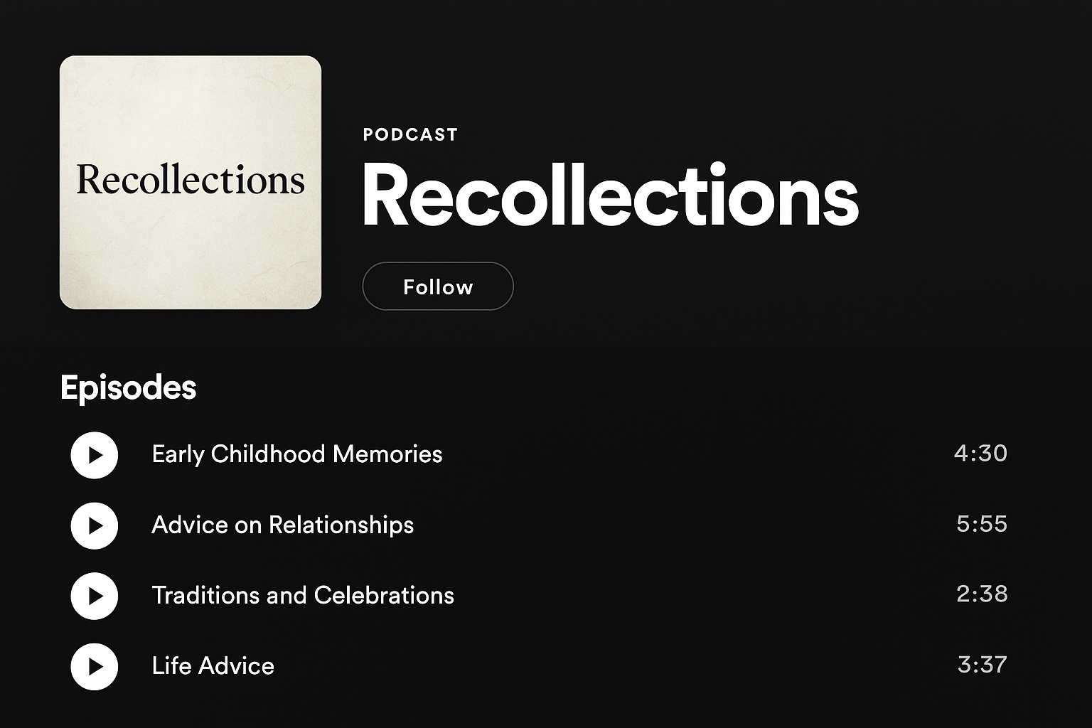 After we’ve captured the audio in the one-on-one Recollections interview, we will create a custom podcast of your loved ones voice within 2-3 weeks that you’ll be able to share with your family & friends.